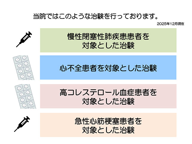 一般的に第 I 相試験から第 III 相試験までを「治験」と言います。当院では、主に第 II 相試験、第 III 相試験を実施しています。現在市販されている主な薬はすべて、この「治験」という段階を経ており、治験に参加して頂いた方々のご協力によって、薬として承認されています。